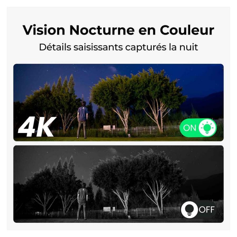 La caméra fournit des images HD 4K 8MP détaillées 24 heures sur 24. La nuit, allumez le projecteur pour une vision nocturne en couleur ou éteignez-le pour une vision nocturne en noir et blanc.