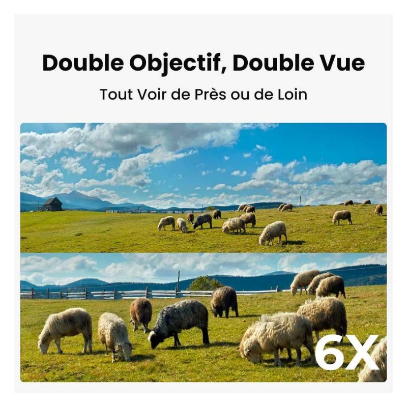 Le Reolink Trackmix Series G770 combine les objectifs grand angle et téléobjectif, affichant les deux vues sur un seul écran. Avec un panoramique de 355° et une inclinaison de 90°, elle offre une couverture de 360°. La vue rapprochée utilise un zoom hybride 6x et des capacités de PT pour suivre et mettre au point les cibles.