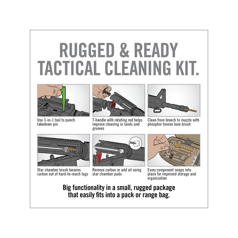 Étui résistant aux intempéries : Le kit de nettoyage est livré avec un étui tactique compact et résistant aux intempéries. Le design zippé et la coque balistique en nylon offrent un stockage sécurisé et une protection pour vos outils de nettoyage, garantissant leur maintien en parfait état même dans des environnements difficiles.