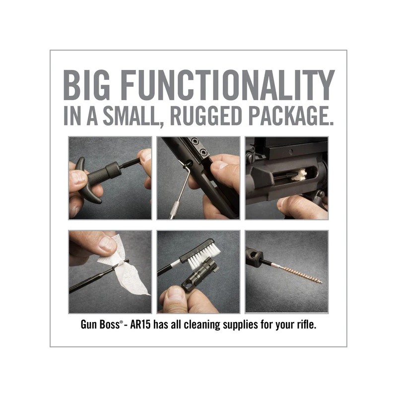 Le kit de nettoyage GUN BOSS spécial AR15 est rangé dans un étui à zip résistant aux intempéries.