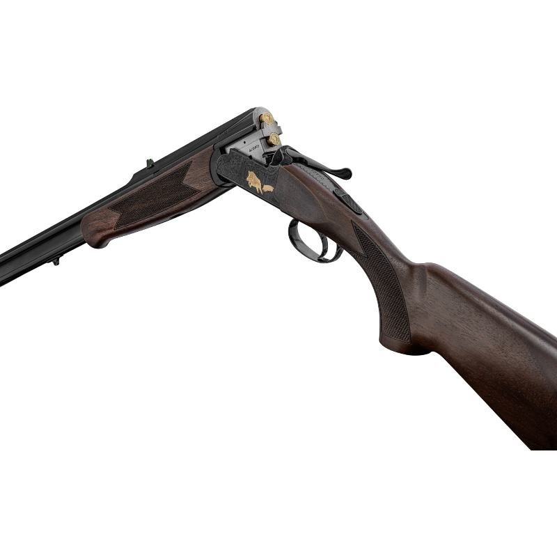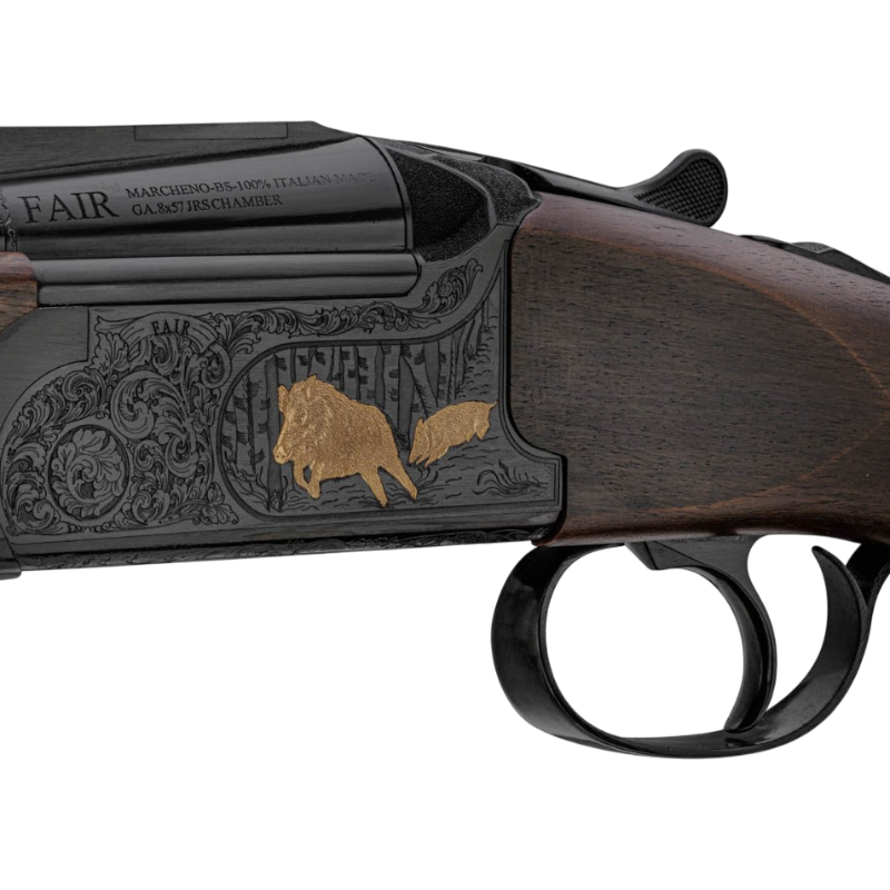 Une carabine Express raffinée avec sa bascule noire avec sanglier doré en action de chasse.