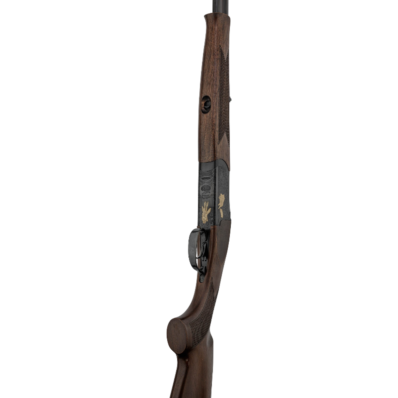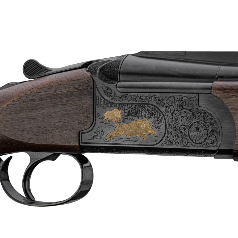 Une carabine Express raffinée avec sa bascule noire avec sanglier doré en action de chasse.